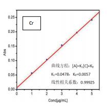 分別精密移取0.0mL、0.1mL、0.2mL、0.3mL、0.4mL、0.5mL鉻標(biāo)準(zhǔn)溶液置于5個(gè)100mL 容量瓶中,用質(zhì)量分?jǐn)?shù)1%硝酸溶液稀釋至刻度,得到每1mL 溶液含鉻分別為0μg、1μg、2μg、3μg、4μg、5μg的系列標(biāo)準(zhǔn)溶液。