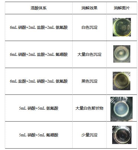 采用不同混酸體系來進(jìn)行實(shí)驗(yàn),消解效果如下:
