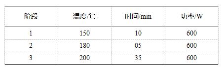 使用硝酸、鹽酸和氫氟酸作為實(shí)驗(yàn)的消解試劑,稱取鉍精礦樣品0.1g(精確至0.1mg)于消解罐中,加入6mL鹽酸、2mL硝酸、0.5mL氫氟酸,靜置5min左右,組裝消解罐,按照如下設(shè)置參數(shù)進(jìn)行實(shí)驗(yàn):