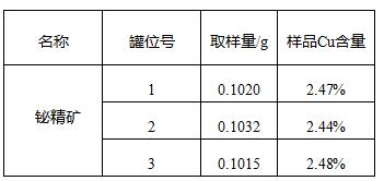 測試結(jié)果顯示鉍精礦中銅元素的含量在2.47%左右,結(jié)果在含量范圍內(nèi)。