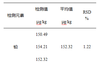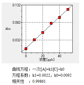 鉛標準使用液:準確吸取適量鉛標準儲備液于50mL容量瓶中,用硝酸溶液(2%)定容至刻度,得到含鉛量分別為0mg/L、10μg/L、20μg/L、30μg/L、40μg/L和50μg/L的標準系列溶液。